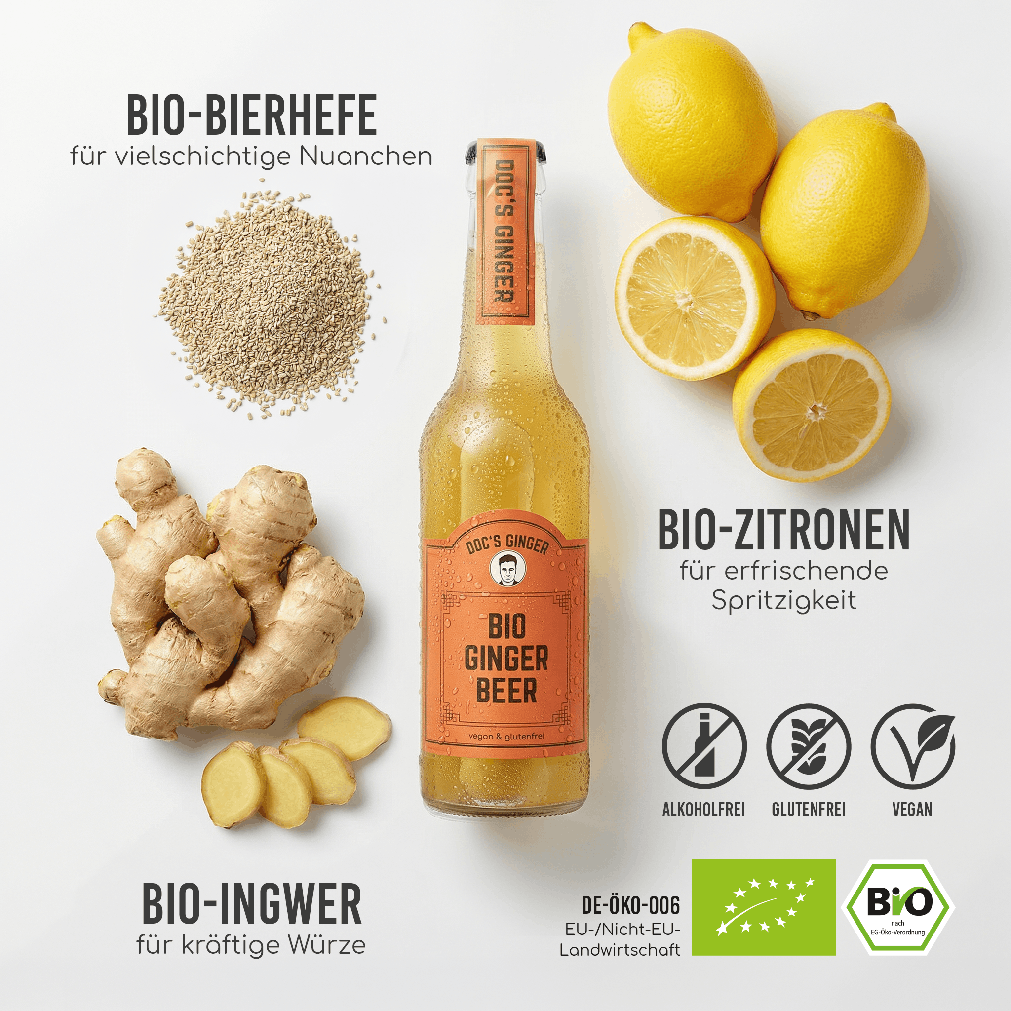 Obergärige Bio-Bierhefe: reich an Vitaminen & Eiweiß, macht unser Ginger Beer erfrischend, nahrhaft und alkoholfrei.